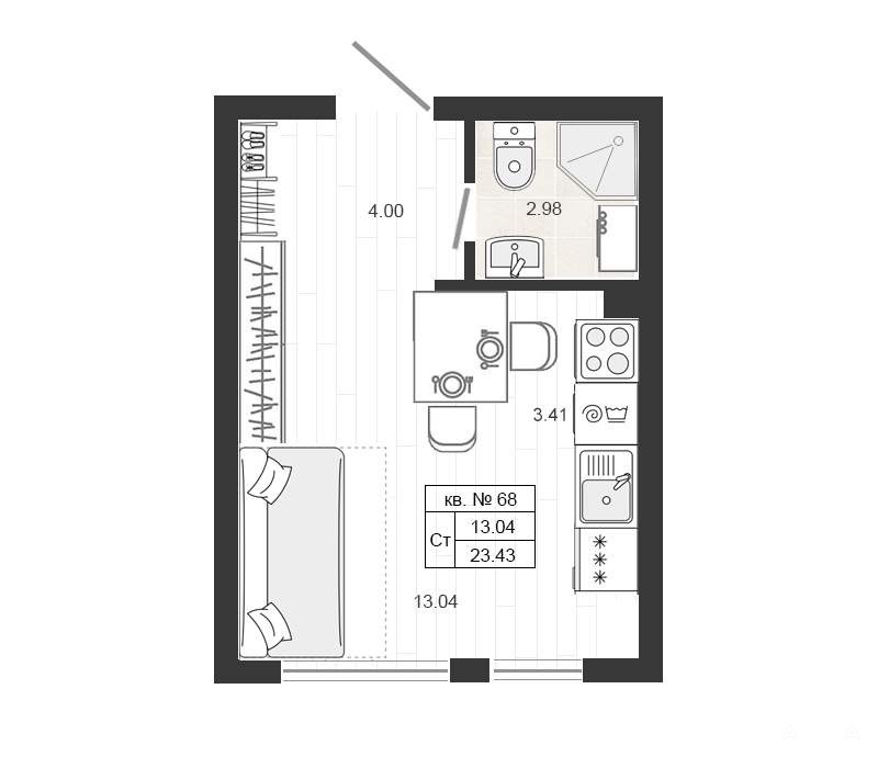 Жилая площадь 13.04 м2, кухня 3.41 м2, чистовая отделка, комнаты смежные, совмещенных санузлов - 1.