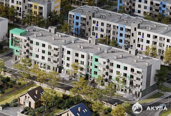 В 10-ти четырехэтажных корпусах сможет поселиться 1171 семья. Дома располагаются блоками, образуя уютные закрытые и безопасные дворы с большим количеством зеленых насаждений и с зонами отдыха для взрослых и детей.