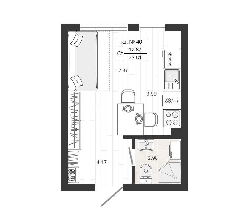 Жилая площадь 12.87 м2, кухня 3.59 м2, чистовая отделка, комнаты смежные, совмещенных санузлов - 1.