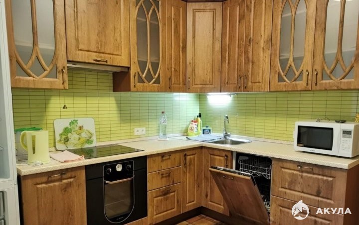 Полностью оборудованная кухня: холодильник, плита с 4 конфорками, духовка, микроволновка, электрический чайник, небольшой набор посуды.