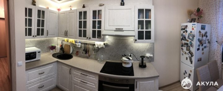 Полностью оборудованная кухня: холодильник, плита с 4 конфорками, духовка, микроволновка, электрический чайник, небольшой набор посуды.